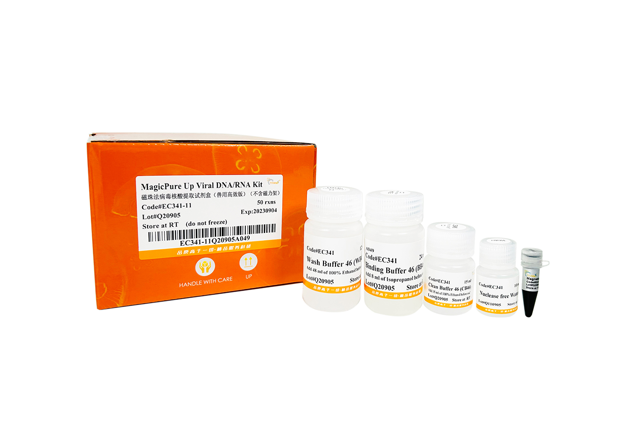 Este kit foi desenvolvido para lise rápida de amostras aquáticas e de animais, liberando DNA/RNA viral, seguido pela purificação do DNA/RNA viral usando esferas magnéticas à base de sílica. É adequado para extrair DNA/RNA viral de ≤200 μl de sangue total, plasma, soro, fluidos orais/nasais, urina, tecidos, fezes, ração e amostras ambientais. O produto resultante é altamente puro e adequado para experimentos como PCR, RT-PCR, qPCR e qRT-PCR.